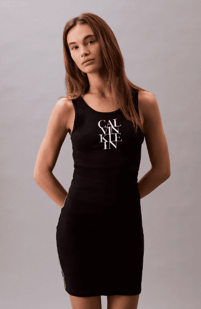 - Cotton Rib Logo Graphic Mini Tank Dress (Original Price $89) for $35.60: A chic, body-hugging dress featuring the signature Calvin Klein logo, perfect for effortless off-duty style.