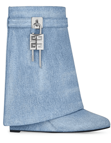 - Givenchy Shark Lock Ankle Boots in Washed Denim (Original Price $2050): A bold twist on the classic silhouette, crafted in washed denim for a chic, street-luxe edge.
