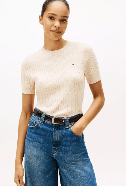 - Short-Sleeve Cable Knit Sweater (Original Price $69.50) for $55.60: A modern twist on a classic knit, this chic short-sleeve sweater is perfect for stylish layering this fall.